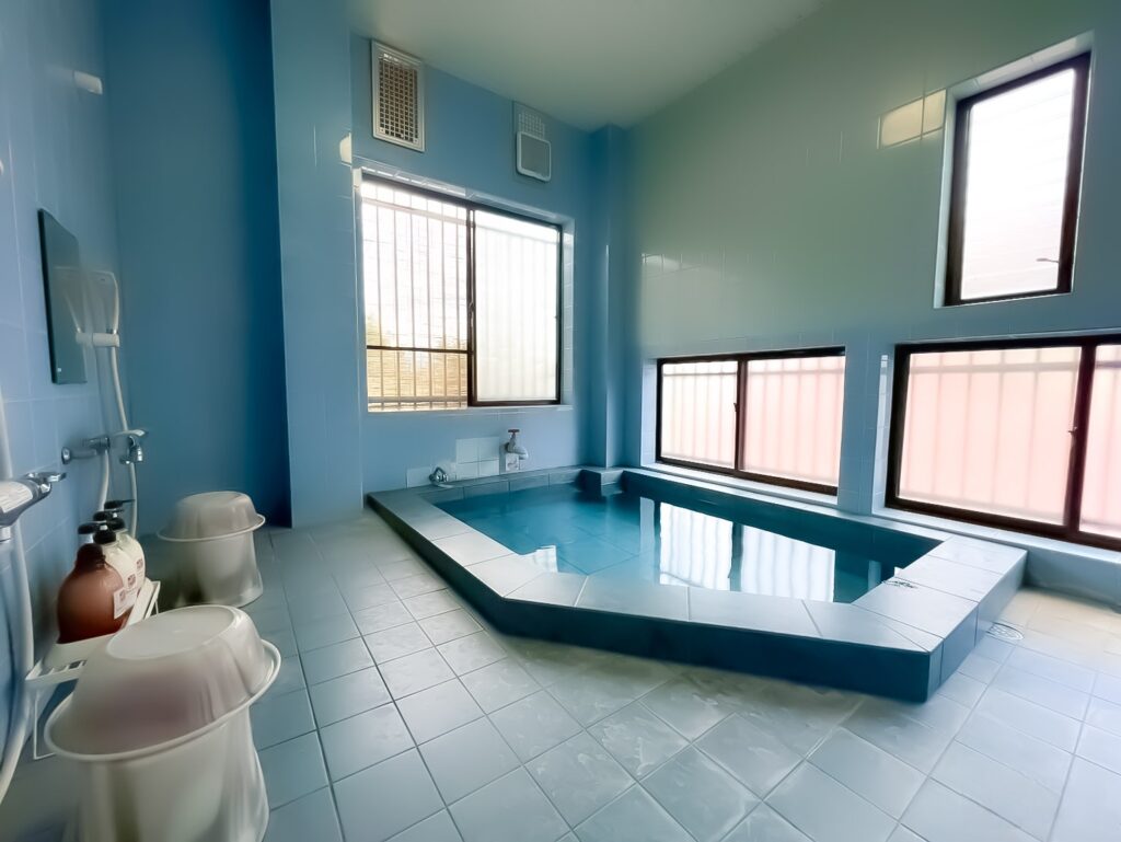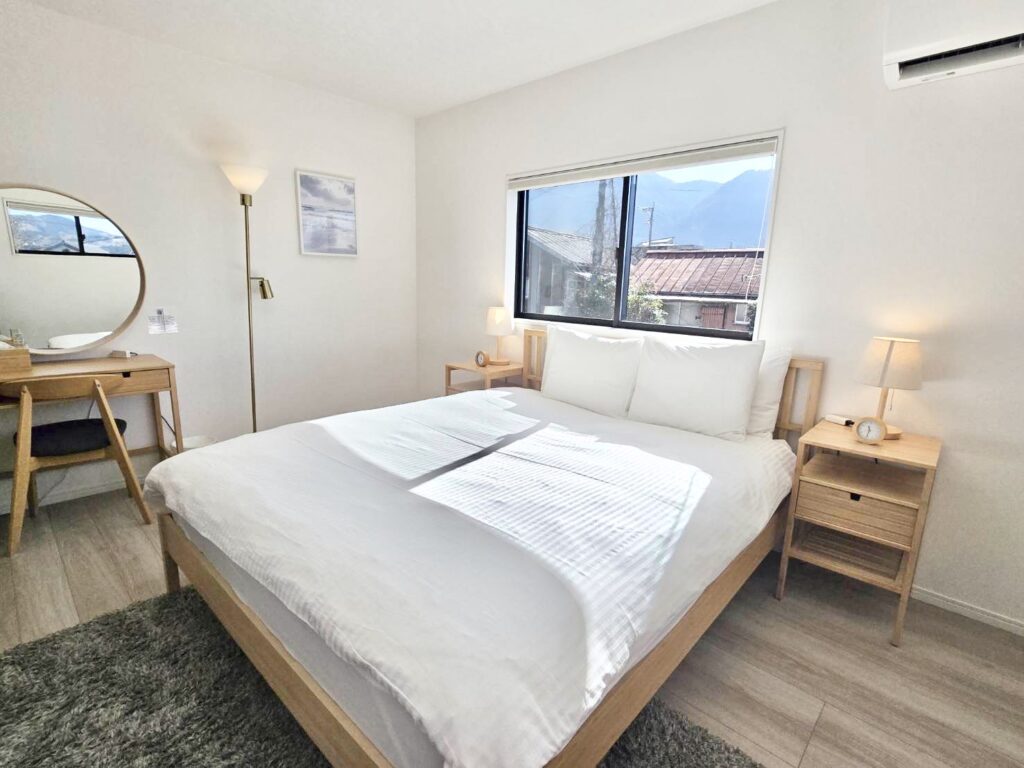 ゲストハウス、ブルーハウスは「湯の坪街道」のすぐそばに位置しており、銀鱗湖まで徒歩10分以内の距離にございます。1階に露天風呂、リビング、オープンキッチン、2階の3つの部屋で構成された一戸建てに最大6人まで宿泊することができます。また、約3台ほど無料駐車場がございますので、レンタカーのご利用にも最適です。